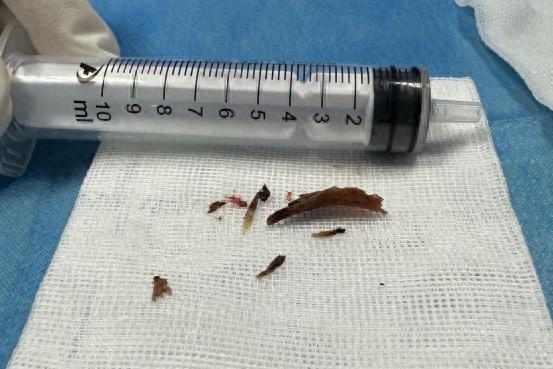 面对这样的挑战,医生们没有退缩,而是灵活运用了激光技术,先对周围的肉芽组织进行精准切割,以暴露异物;随后,利用冷冻技术进一步松动异物与周围组织的粘连,减少取出时的创伤;最后,通过精细的钳夹技术,历经数次尝试,终于将这块困扰患者半年的异物——一块长约2厘米的动物骨头,完整地取了出来。
